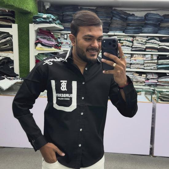 Pair this black graphic designer shirt with light beige chinos, denim jeans, or slim-fit trousers and sneakers for a modern and confident casual look.