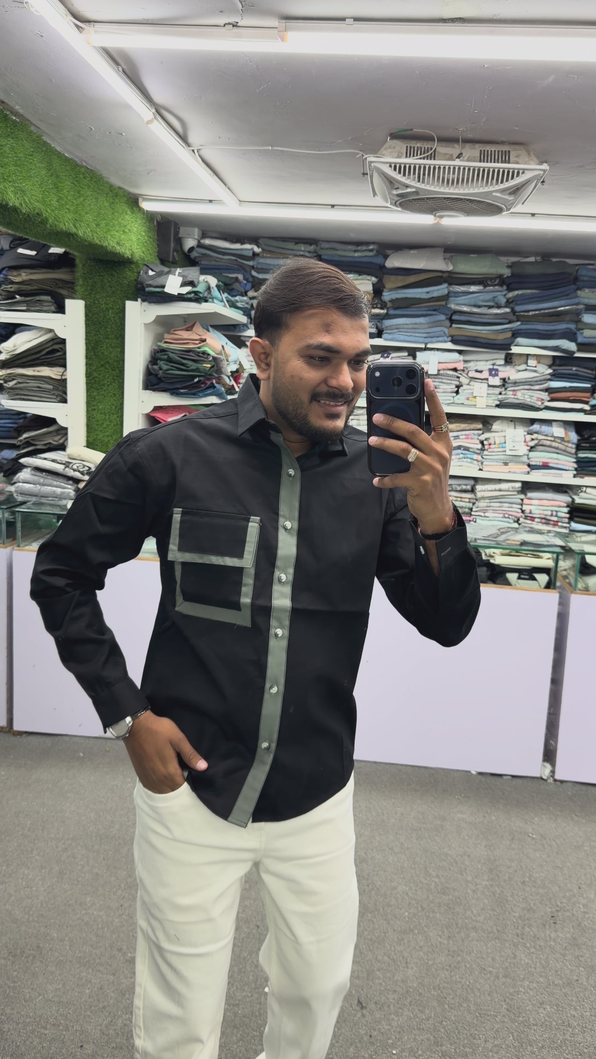 Pair this black contrast shirt with beige chinos or grey trousers and sneakers for a sleek, modern, and balanced outfit.