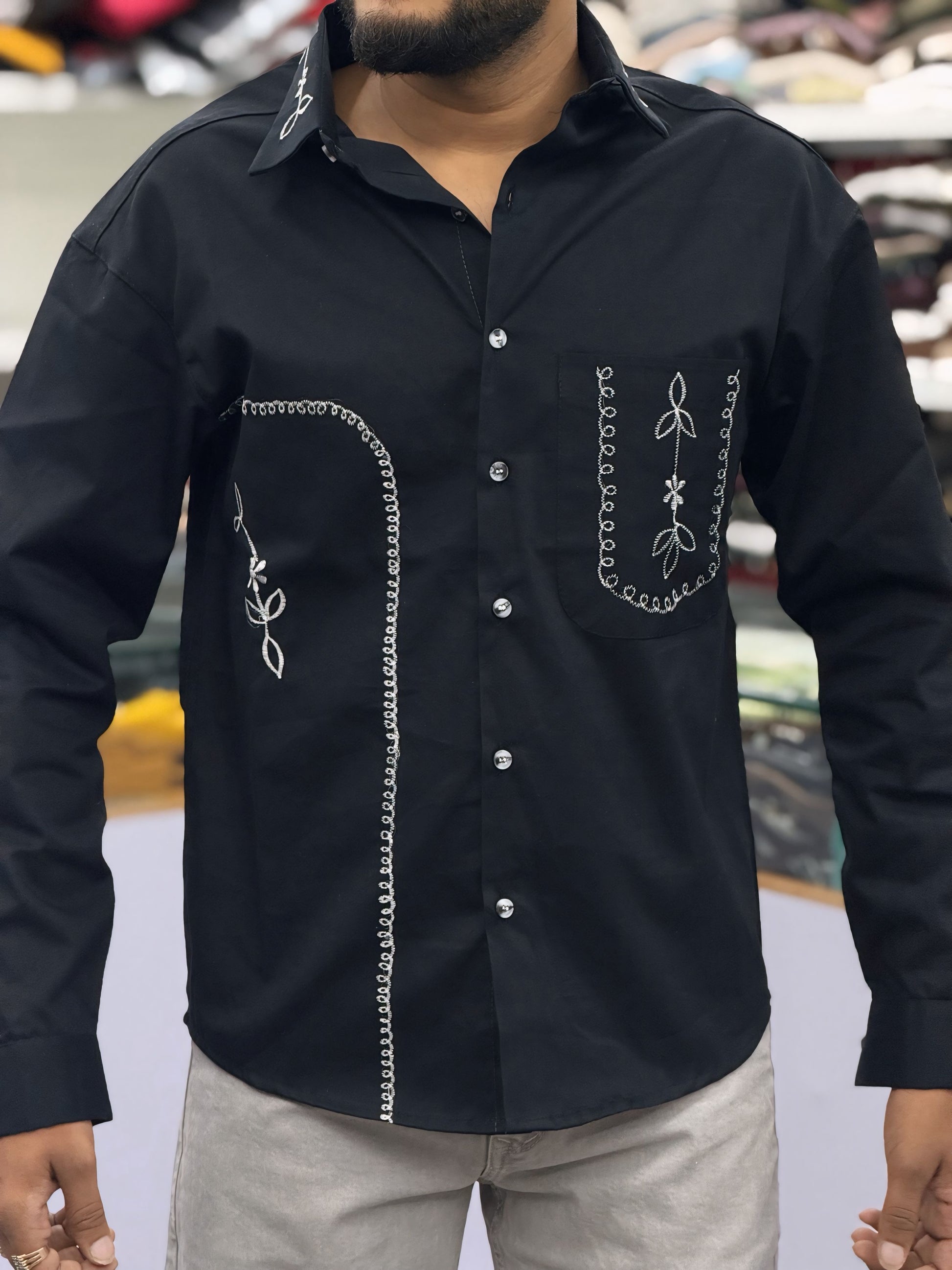Upgrade your wardrobe with this Men’s Black Cotton Shirt featuring elegant white embroidery and designer pocket detailing. Crafted for men who appreciate minimal fashion with artistic craftsmanship, this shirt blends classic black style with modern designer elements.