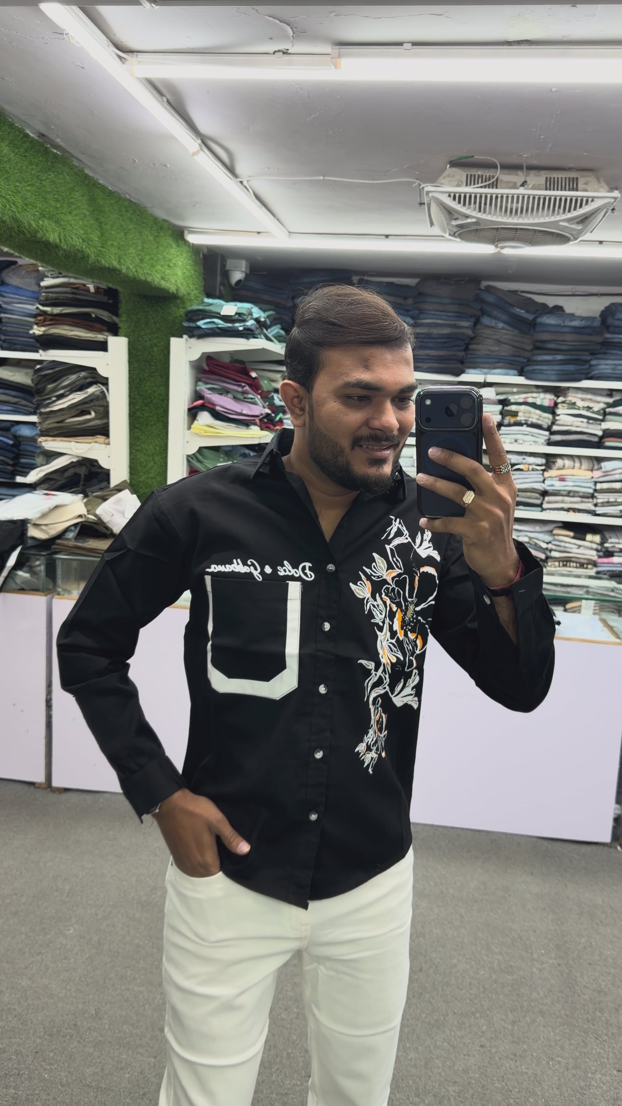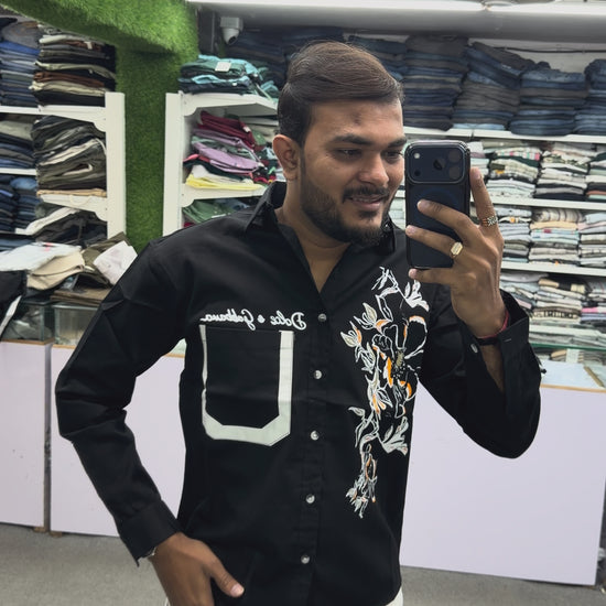 Pair this black graphic designer shirt with light beige chinos, denim jeans, or slim-fit trousers and sneakers for a modern and confident casual look.