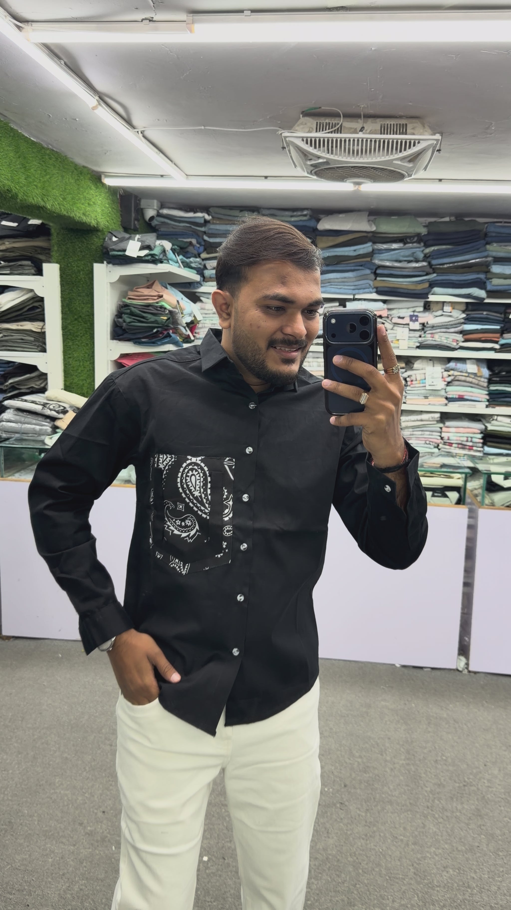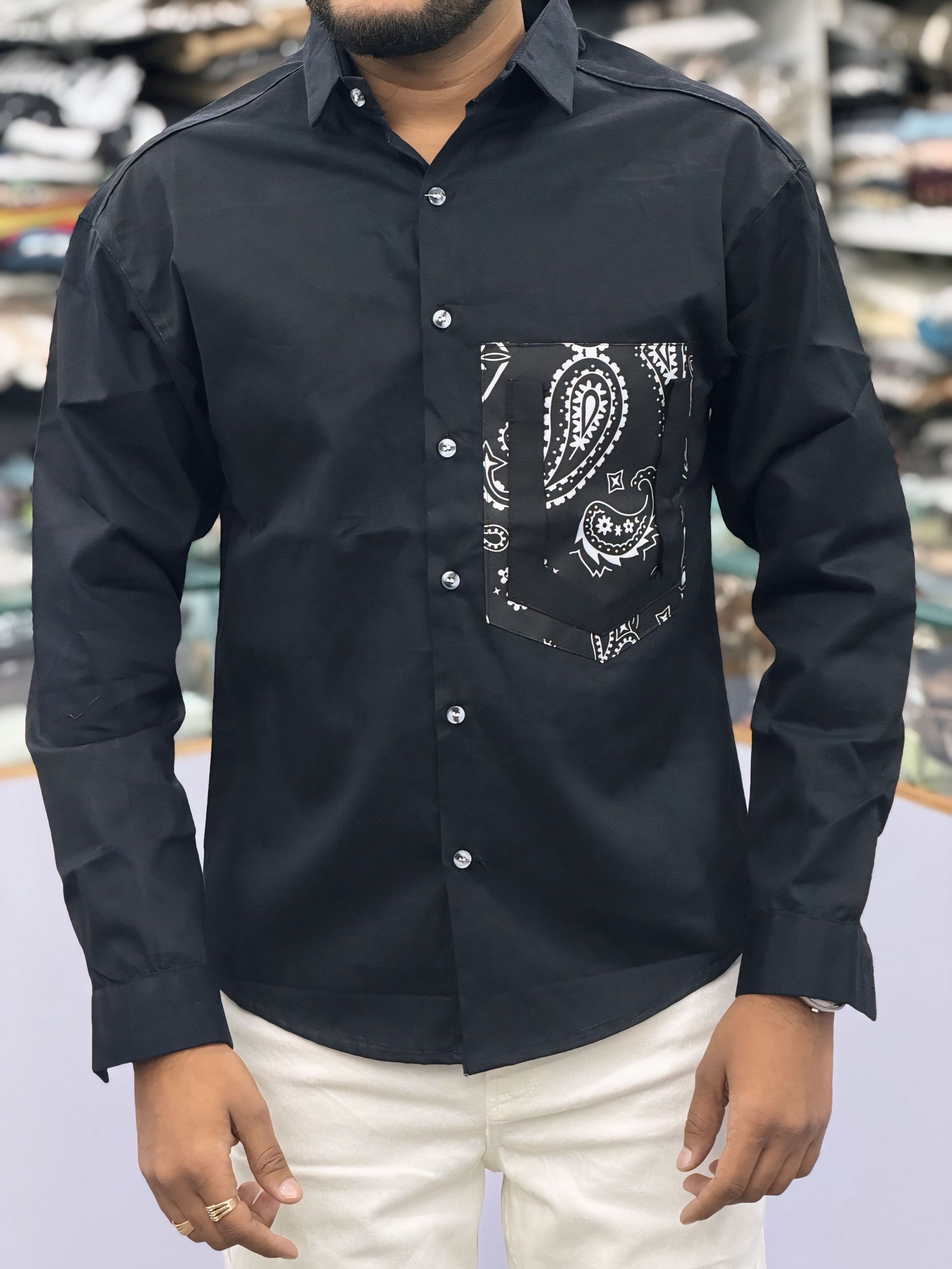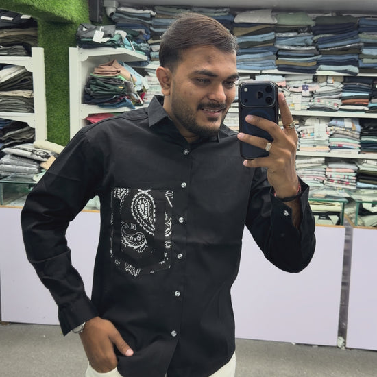 Upgrade your wardrobe with this Men’s Black Paisley Pocket Shirt, designed for those who prefer subtle fashion with a unique twist. The shirt features a contrast paisley (bandana) printed pocket, adding a stylish highlight to the classic black design.