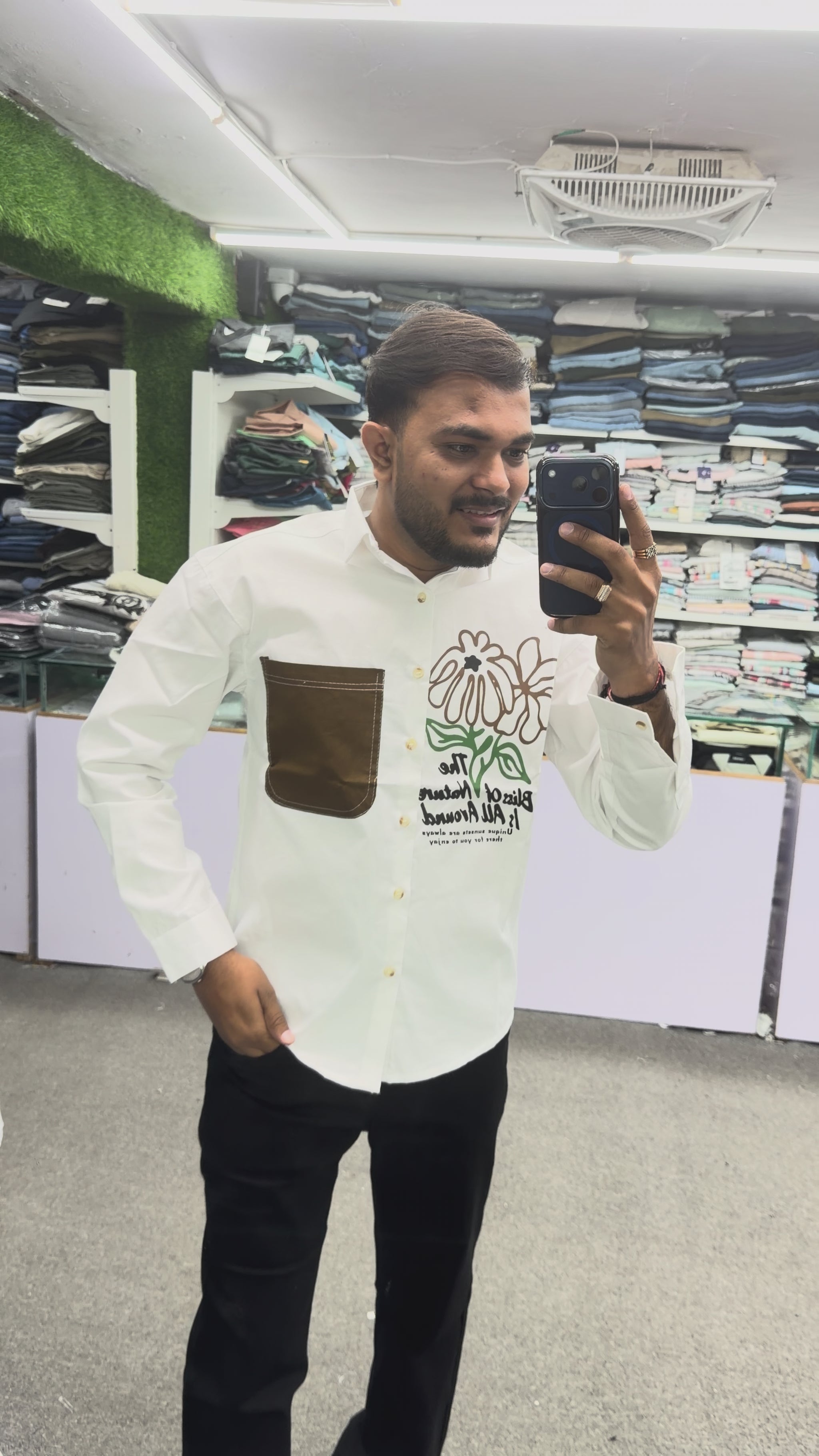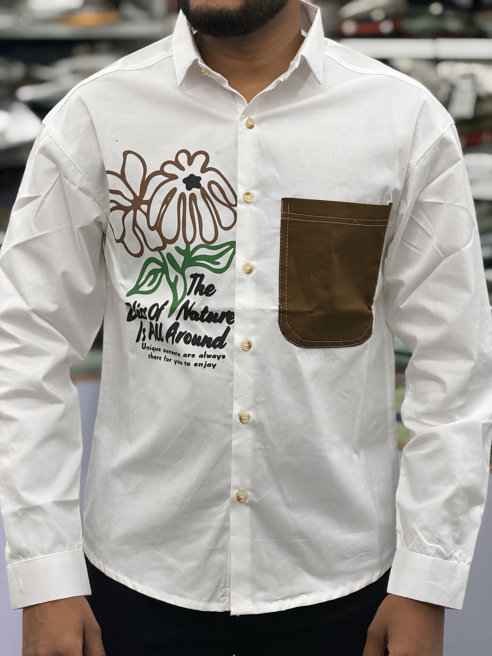 Elevate your everyday style with this Men’s White Casual Cotton Shirt featuring a bold brown contrast pocket and artistic floral graphic print. Designed for modern men, this shirt offers a perfect blend of simplicity and standout design, making it ideal for both casual and semi-formal occasions.