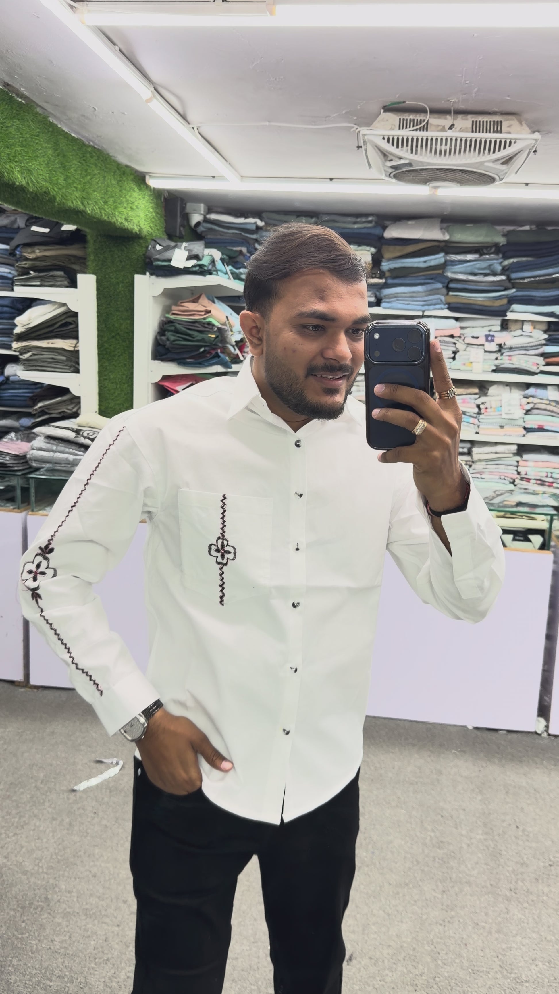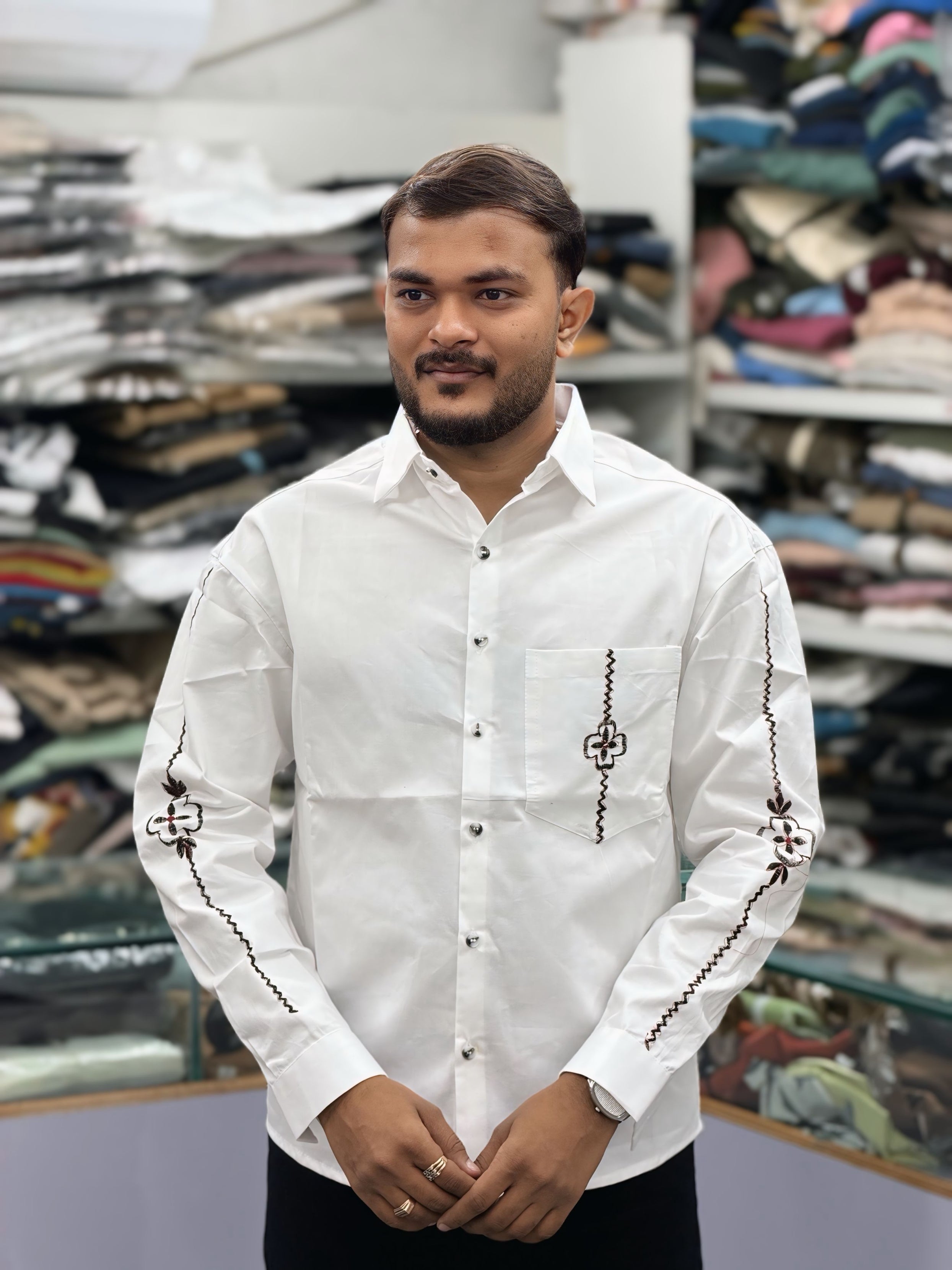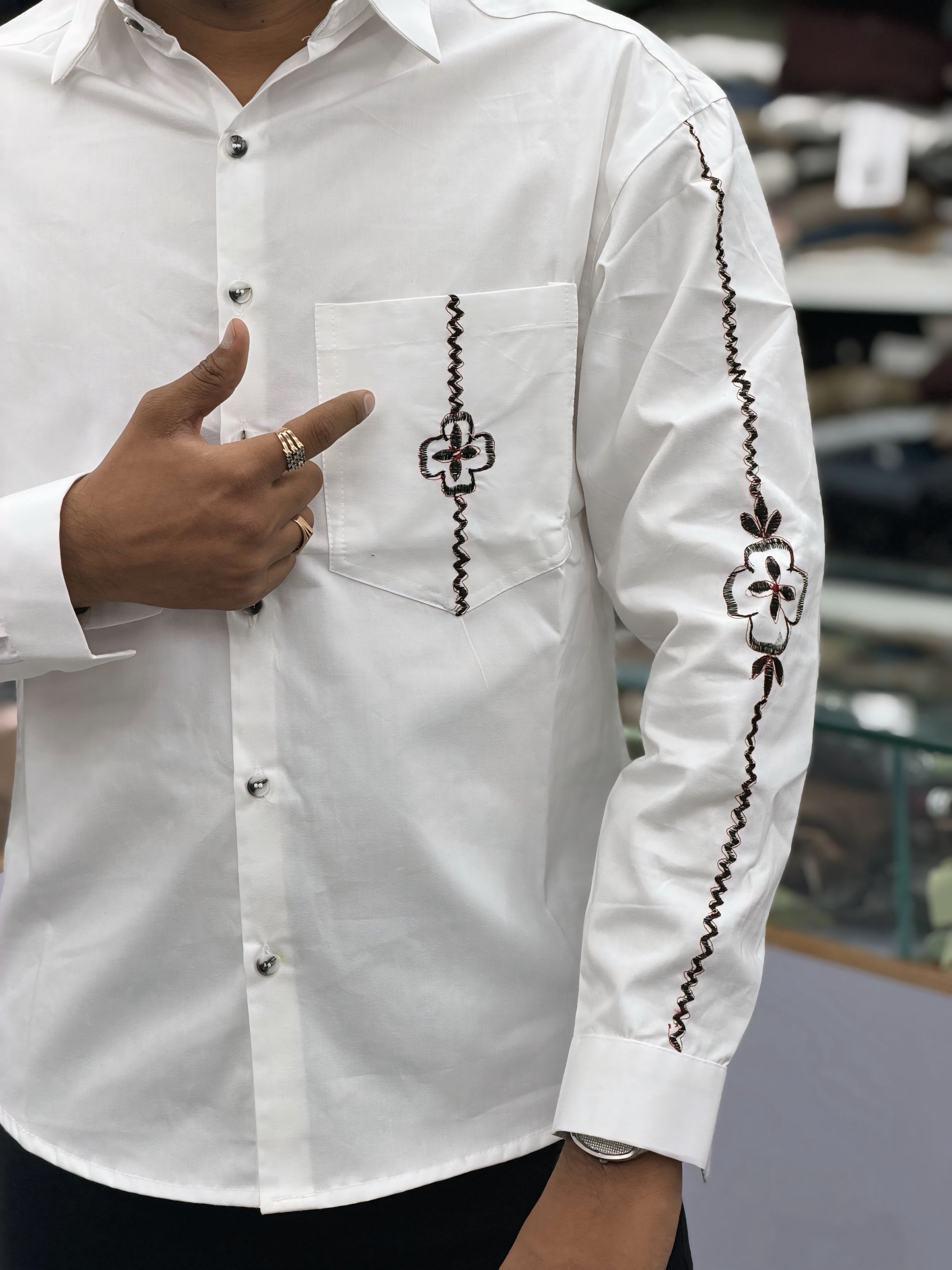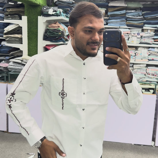 Step into refined style with this Men’s White Cotton Shirt featuring unique black embroidery on the sleeve and pocket. Designed for men who appreciate minimal fashion with a premium touch, this shirt adds subtle sophistication to your everyday wardrobe.